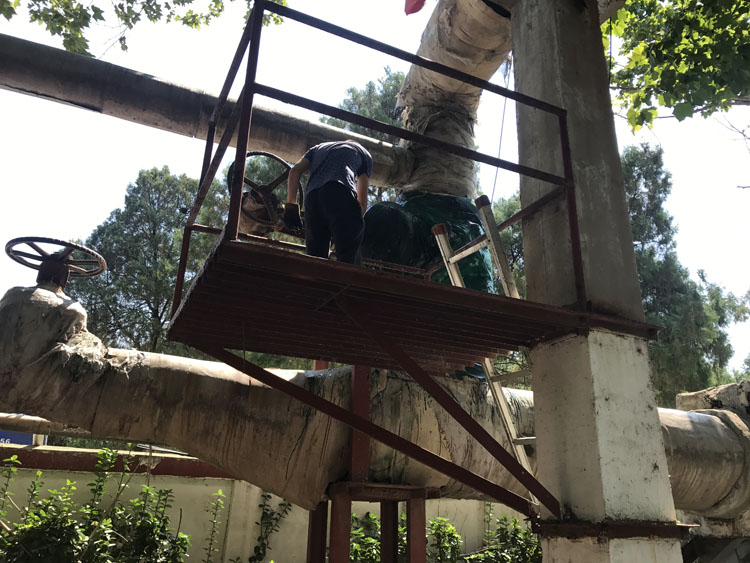 在鐵塔寺小區(qū)檢修現(xiàn)場,幾名檢修人員正頂著近36度的高溫對二次網(wǎng)管道的保溫進(jìn)行修補(bǔ)、更換。雖然天氣悶熱,但為了保證冬季供暖效果、減少不必要的損耗、確保設(shè)備狀態(tài)良好,他們加班加點(diǎn),趕著在天黑之前完成此項(xiàng)檢修工作。