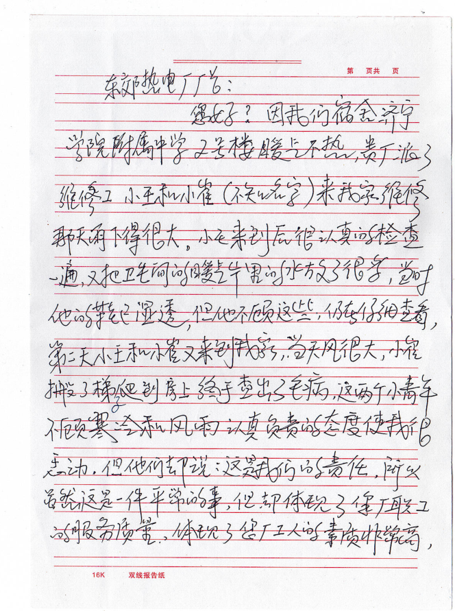 近日,山東聚源熱力公司收到一封來自濟(jì)寧學(xué)院附屬中學(xué)宿舍張老師寫的表揚(yáng)信,信中這樣寫道:“東郊熱電廠廠長(現(xiàn)為山東聚源熱力)您好,因我們宿舍濟(jì)寧學(xué)院附屬中學(xué)2號(hào)樓暖氣不熱,貴廠派了維修工小王和小崔(不知名字)來我家維修。那天雨下得很大,小王來到后很認(rèn)真的檢查一遍,又把衛(wèi)生間的暖氣片里的水放了很多,當(dāng)時(shí)他的鞋已濕透,但他不顧這些,仍在仔細(xì)查看。第二天小王和小崔又來到我家,當(dāng)天風(fēng)很大,小崔搬了梯子爬到房上終于查處了毛病,這兩個(gè)小青年不顧寒冷和風(fēng)雨認(rèn)真負(fù)責(zé)的態(tài)度,使我很感動(dòng),但他們卻說這是我們的責(zé)任。雖然這是一件平常的事,但卻體現(xiàn)了您廠職工的服務(wù)質(zhì)量,體現(xiàn)了您廠工人的素質(zhì)非常高,也體現(xiàn)了您廠的廠風(fēng)正,培養(yǎng)了這么好的職工,請(qǐng)領(lǐng)導(dǎo)對(duì)他們進(jìn)行表揚(yáng),號(hào)召全體職工向他們學(xué)習(xí)。弘揚(yáng)正氣,使我們的社會(huì)更加和諧。”